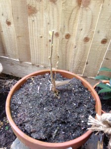 Given that they take about seven years to go from (current status of) twig rather hopefully shoved in a pot to glorious tree, I thought that we could get the pot phase over and done with. And lo! After months of sitting there looking nothing but sad, bare and twiggy, I’m pleased to report that buds have been spotted. Hopefully it’s all go from now on and in a mere handful of years, we’ll be gorging ourselves on fragile black fruits!