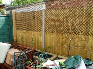 As you can see, when they arrived I measured out the distances between them carefully. They look a puny at the moment but once they’re established in about two years time, I hope that they’ll have spread enough to cover the fences completely with delicious fruit and we should be harvesting kilos of fruit. Which is good, because my addiction to soft fruits costs us a fortune every year.