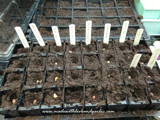 | Seedlings being labelled, two seeds per pot ready for thinning |