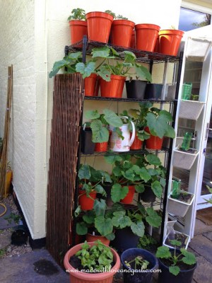 I tend to rotate the plans so that they each get a chance to grown at the front of the shelves and take a turn at the back week on and week off and so far (fingers crossed), it seems to be working! The plants are getting huge and the courgettes in particular have already started flowering. I can’t wait for my first harvest! So voila, vertical gardening is possible even if you’re no good at DIY and don’t want to screw pockets to your wall. The trellis on the side not only stops the pots falling off but more importantly, it stops the cats from using the shelves as a springboard to escape the garden. And the pots made from hacked IKEA storage are supported well!