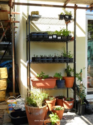 One of the things I wanted to do with my garden was to ensure that I could grow slightly larger plants than would usually be held by most of the systems on the market. Things like squashes, pumpkins and courgettes. So I needed a heavy-duty system that could take the weight of large pots and fit along the very small wall next to my french windows. The solution? Heavy duty wire garage shelving. It’s not the prettiest solution but it does take up to 250kg of pots quite happily and increases my growing space enormously.
