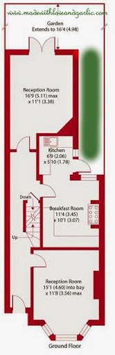 A typical feature of the terraced Victorian houses in London is the side return. This is the name generally given to the narrow strip of garden running along the side of the building from the kitchen to the main part of the garden. It’s generally narrow and, between you and I, more than a bit of a waste of space. You can see ours marked in green on our ground floor floorplan on the right.