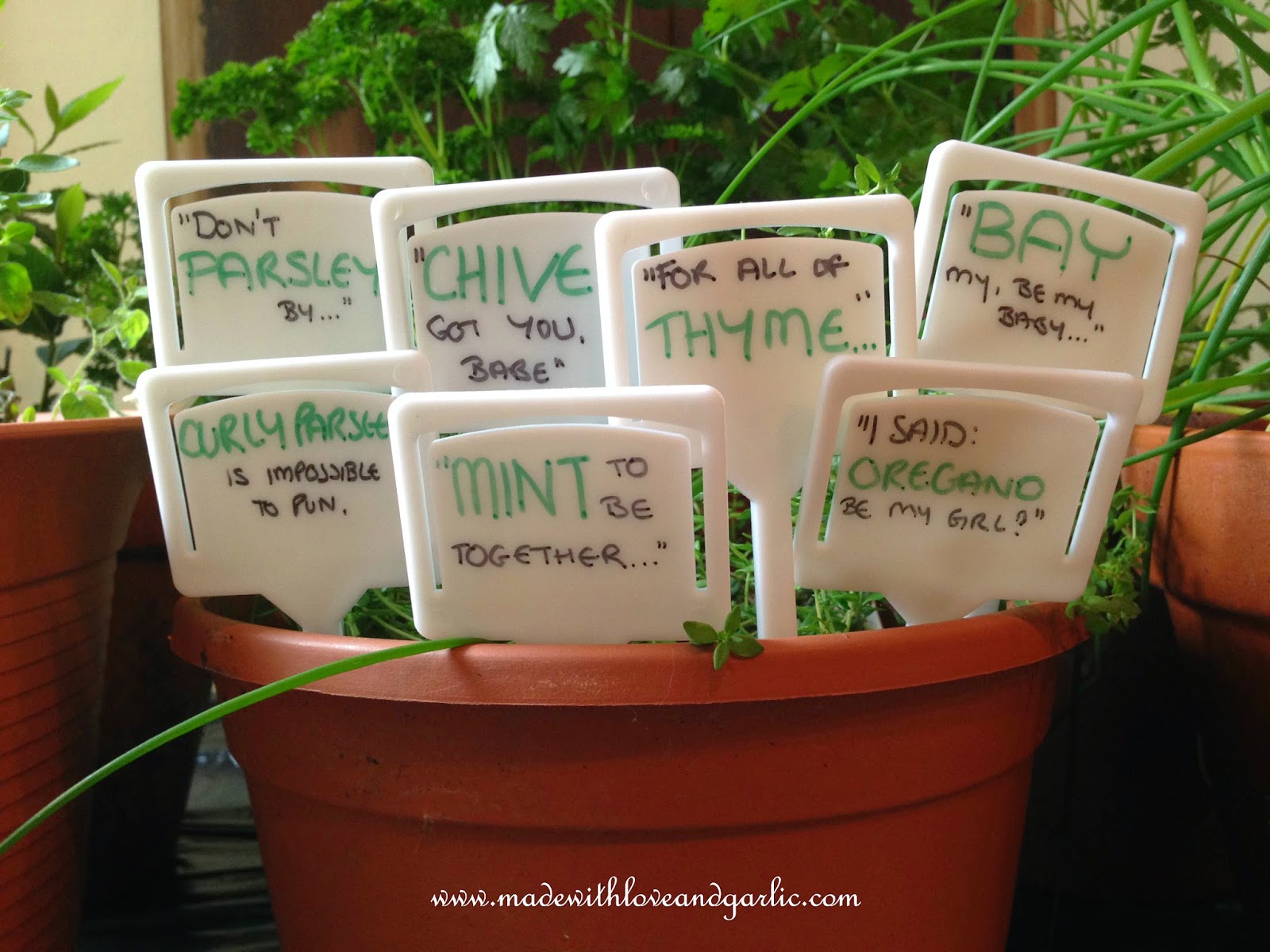 The puns (which I regard as the highest form of wit) weren’t too easy to pull together as I wanted to keep music or love references involved where I could but we managed to get some passable ones and they appeared to go down well. So there you have it, a wedding present or wedding favour of a herb buffet.