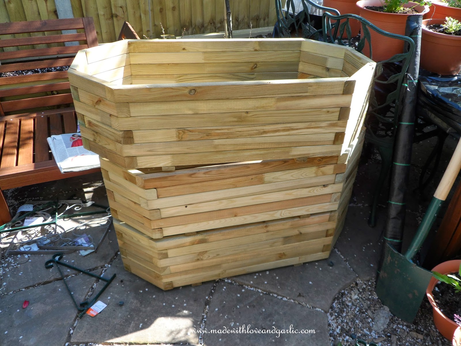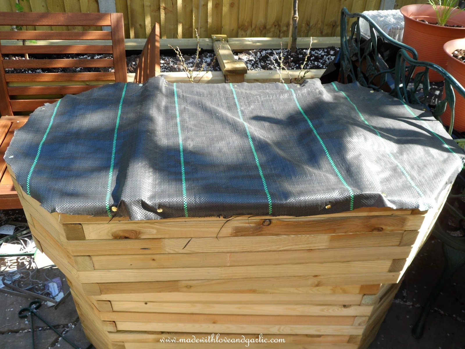1. Buy some raised beds and a couple of rolls of woven weed-proof membrane. It needs to be woven so that it will allow water to drain away from the beds (otherwise you’ll end up with raised ponds).