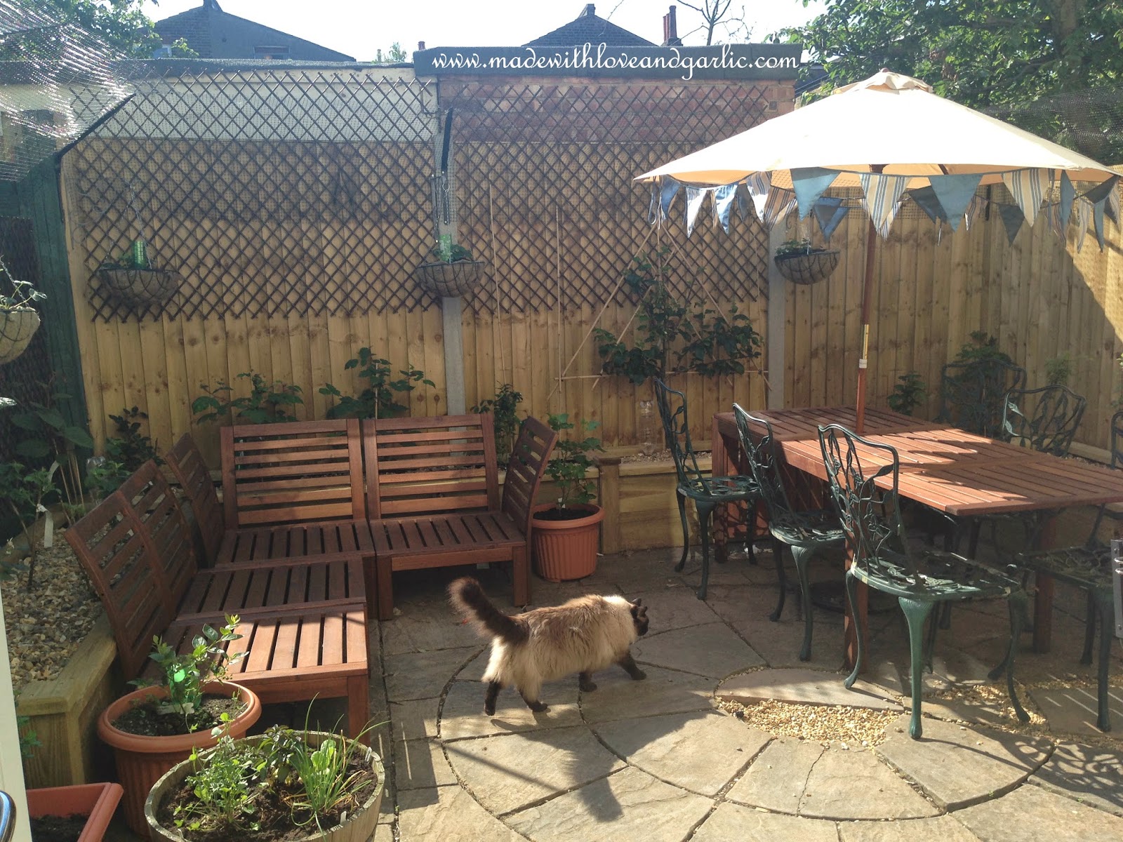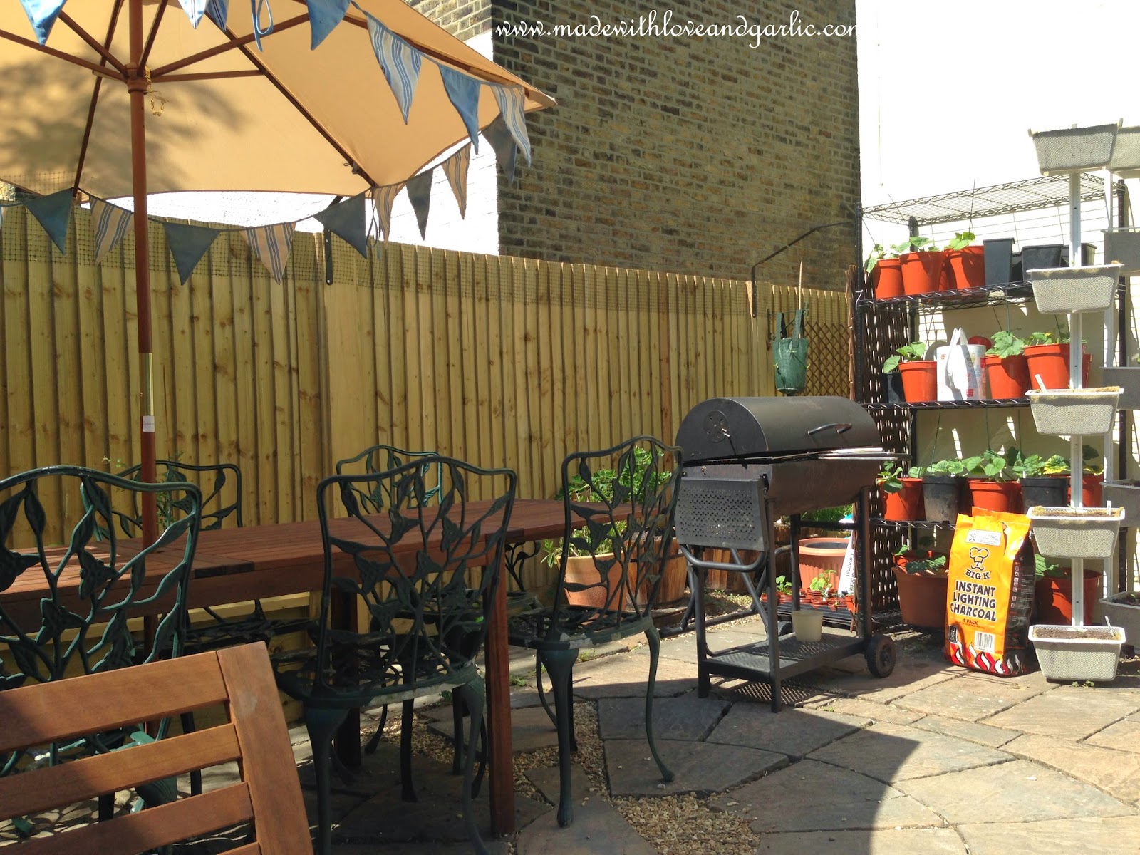 Whilst I want to grow as much of our produce as possible, I also want to ensure that our tiny patio garden is somewhere we have space to relax. One of the problems with living in the city is how little space there is overall and dividing it up between practical and relaxing areas. I’ve managed to do this partly by planting on shelves or in raised beds, but also by using the side return as a place to store plants when we have guests or we just want a relaxing weekend enjoying our very small garden. By tidying all of our pots away, we managed to make the garden change according to our needs. So voila – what do you think of how tidy it looks? It’s very satisfying being able to have a BBQ (a Portuguese Sardinhada in this case) and to know that all of our lovely crops are still growing away hidden in the background.