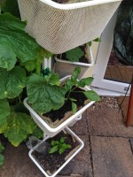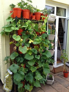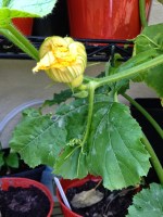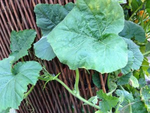 Next year I think I’ll deliberately position all of the squash plants next to the trellis on the side of the shelving so that the vines can cover that and so that the courgettes can get more sun. At the moment the squashes are really aggressive, threading their tendrils onto anything they touch, including leaves of other plants which they puncture. It’s all a bit creepily reminiscent of Day of the Triffids.