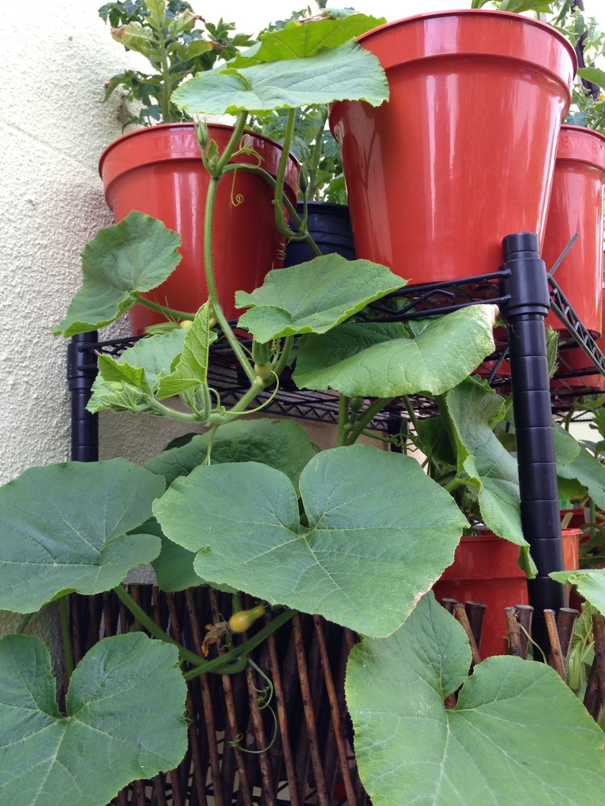 One of the things I’ve already learned this year is that less can be more. I’m not overly convinced that stuffing my outdoor shelving with as many plants in small pots as it can hold was the best of ideas. I suspect that using four larger pots per shelf would have been a better idea. Yet I have to admit, they are thriving! And, as you can see, they’re spreading to block sunlight from other plants with their huge leaves.