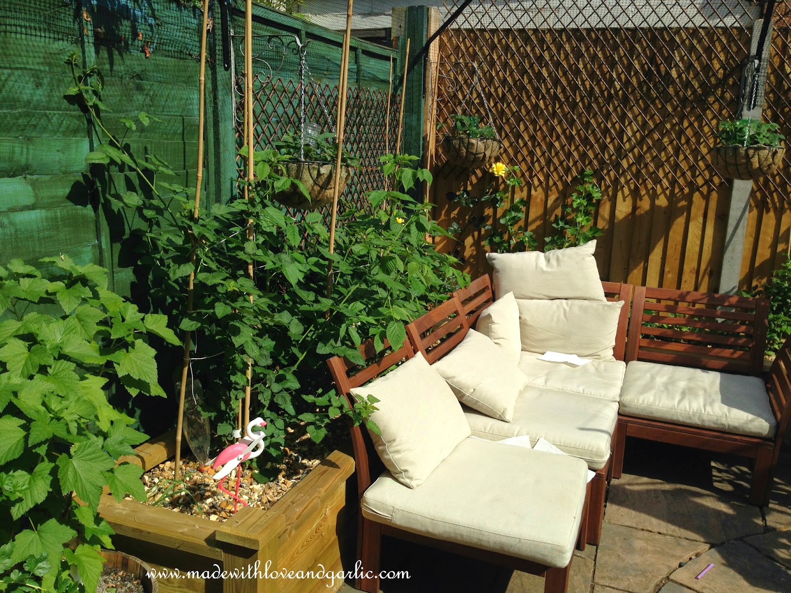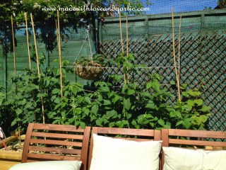 The number of things that I have really not been that efficient at in the garden continues to increase. It didn’t occur to me, when planting my rows of raspberries in my raised sleeper beds, to string up a proper wire frame. This has resulted in having to tie new lines, made of string, across the canes I’m using as a makeshift support every week or as (the plants are shooting up at mad speeds and there are small, underripe fruits hanging in tantalizing bunches from most of the branches – I think it’s possible I’ll get a good crop this year even though the canes are in their first year!). Next year I’m going to have to get a proper support and put it in before they start growing. String really isn’t that strong…