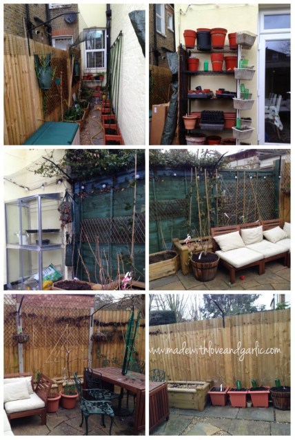 I know, I know, it’s April now. But today I spent an absolutely lovely day gardening and the plants are all going zoom and growing like the clappers and I wanted to document the garden before the real growing takes place. So here it is, relatively bare but with small signs of growth, seen as if you’re looking at the side return and turning 360 degrees clockwise: