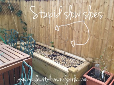 I am so frustrated with my blackthorn bushes. I bought them from one of those “Send a tree as a gift” places as a gift for someone that couldn’t make the Christmas party that I intended to hand them over at. So into the beds they went (and into some mulled apple juice went the accompanying sloe gin). But they’re absolutely awful. They’re growing at a snail’s pace and occupying an entire raised bed as they do so. Last year I got cross and stuck in the peony that I bought at the Chelsea Flower Show sell-off. And this year I think I’m going to make the bed useful. It was supposed to provide me with lots of lovely fat sloes so that I could make South West London Sloe Gin but so far they still look like rubbish twigs in the raised beds. So I’m going to plant something in with them. I haven’t decided whether it’ll be kale or broccoli yet but it’ll probably be one or the other. Stupid slow sloes.