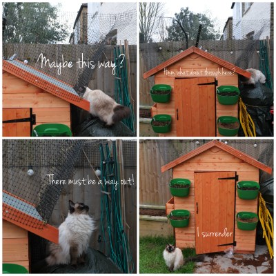 As our son has grown and changed, so has what we need from our garden. Whilst I want to grow as much as I can, GarlicBoy also needs some grass to play on, and we also need space to keep the kinds of things that I don’t want him playing with (think secateurs…) so we got him a tiny playhouse that doubles as a storecupboard when we’re not in the garden. However, the downside of that is that the cats could suddenly hop over the cat-proof fencing that we installed a couple of years ago to keep them in. I still don’t feel entirely comfortable with the idea of keeping the cats in and we’ve decided that when we leave London, we will let them roam freely, but whilst we live in town we’d rather keep them safe. So I spent an afternoon modifying the existing fencing to cover the playhouse roof as well. It was both boring and difficult but it appears to keep the felines in (and the local moggy toughs out) and they’re enjoying being out more often again.
