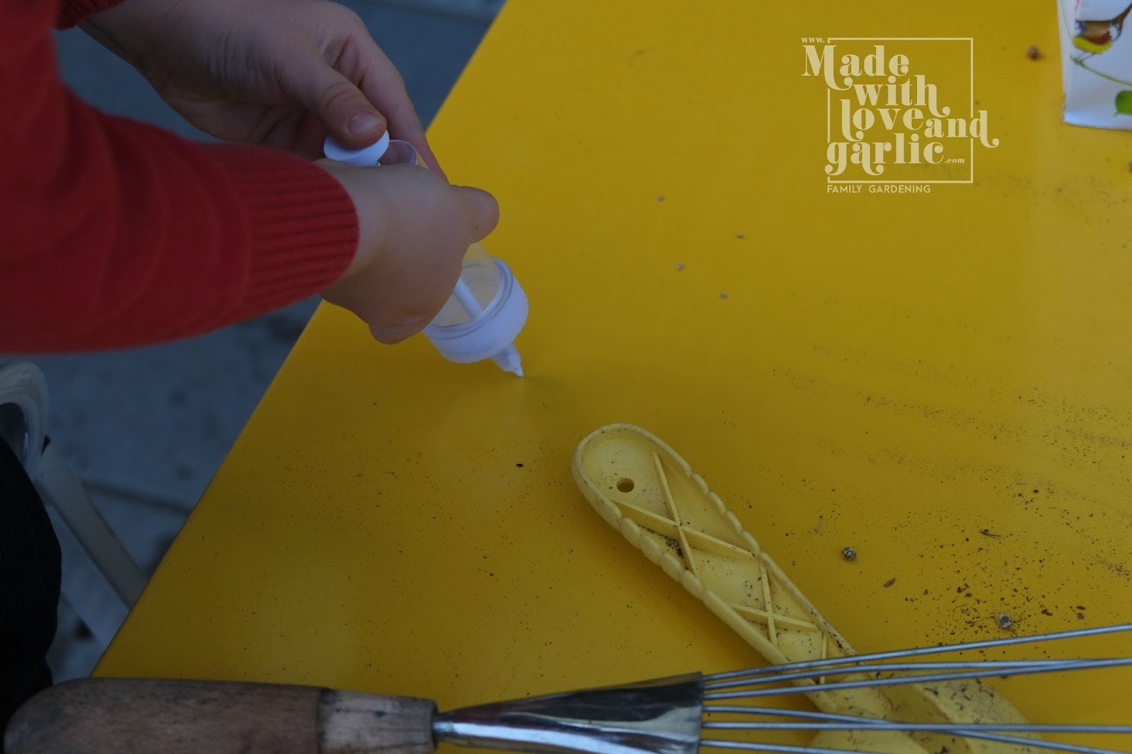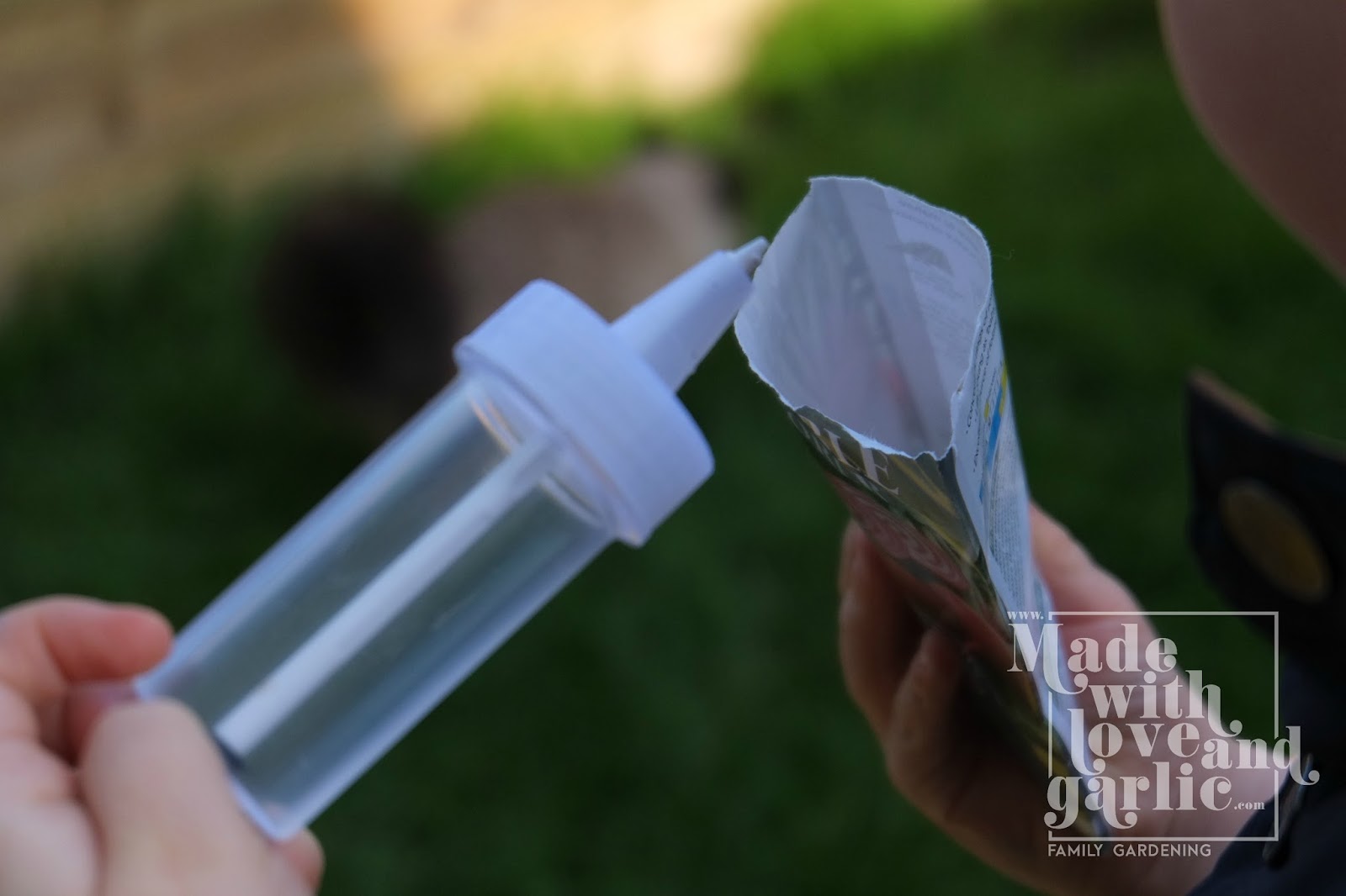 One of the nicest things about gardening with a toddler is how you get to see things you take for granted through their eyes. Sticking seeds into a seed syringe and then using it to sow reliable amounts of seeds is something I’d do without even thinking about it, but GarlicBoy was fascinated by the whole process. He spent a while simply unscrewing and then replacing the lid, and then painstakingly filled it pinch by tiny pinch with tiny carrot seeds. I ended up doing most of the actual sowing of the carrot seeds in the raised beds myself as after spending a good twenty minutes “practising” sowing seeds on our table, sowing them into earth where they were hard to see seemed much less interesting!