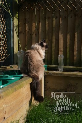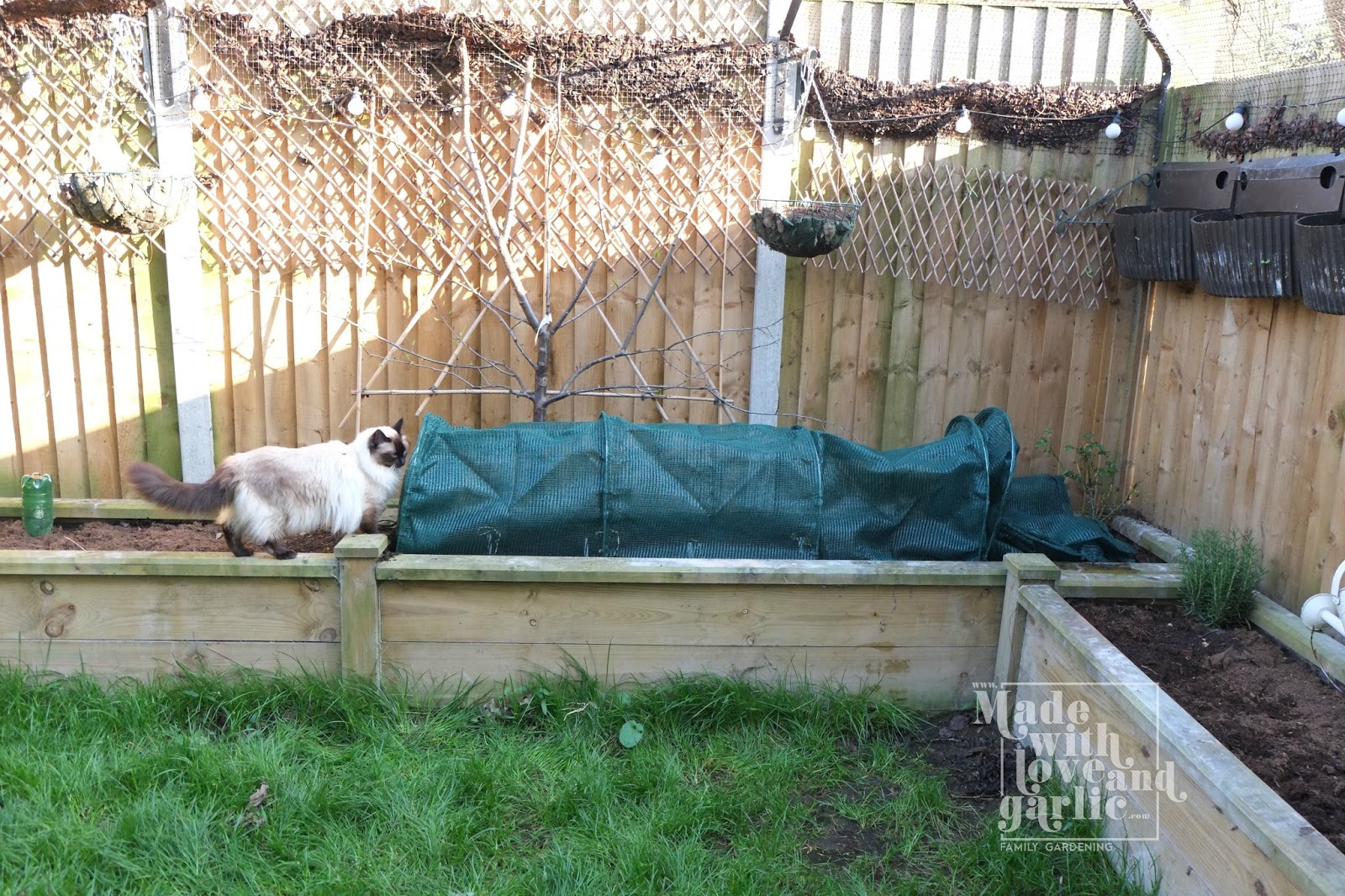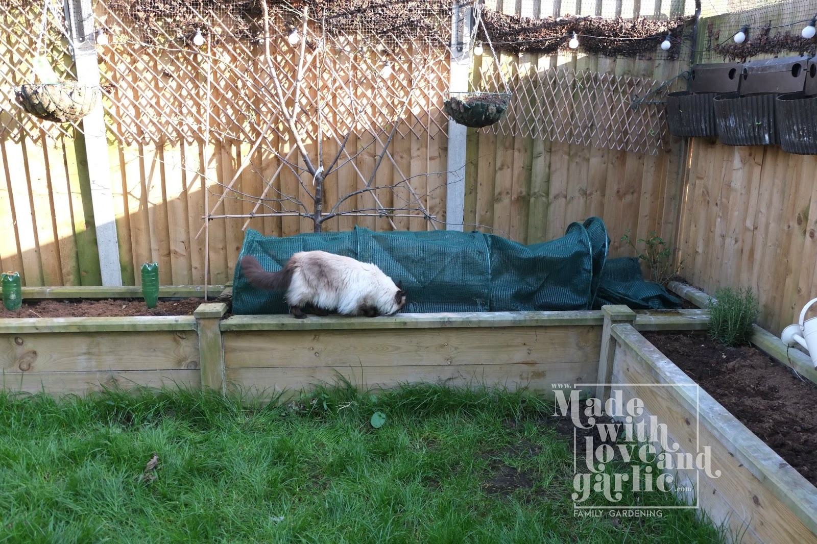Imagine, for a moment, that you are a cat. A fluffy cat, one of a pair, confident in your status as adored object in a house largely ruled by the whims and caprices of small creatures. Now assume that a couple of your humans spent a lovely afternoon planting carrot and beetroot seeds together in a bed that you had mentally marked for your own. Wouldn’t you be cross, if all of a sudden, the larger, shouted human started unceremoniously turfing you off of your previously claimed lovely soft soil bed? And wouldn’t things get immeasurably worse if said larger human started regarding you with suspicion every time you went into the garden? And then the ultimate betrayal; an amazingly fun tunnel thing is laid out on the grass for your amusement. But no! It isn’t for your amusement, it’s a tent cloche thing to protect the tiny seeds where they’ve been sowed and no matter how hard you try, YOU CANNOT GET TO THE FLOWERBED.