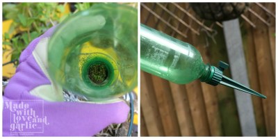 Years ago I decided to install a homemade drip-feed system of soda bottles to water my pots and raised beds. But having filled the one nearest to my beloved plum tree yesterday, I noticed this morning that the water level hadn’t dropped. The culprit was the lid of the old water bottle I was using. Soil had crept inside the hole over the course of last year and a rather unattractive moss had grown inside and blocked the hole.
