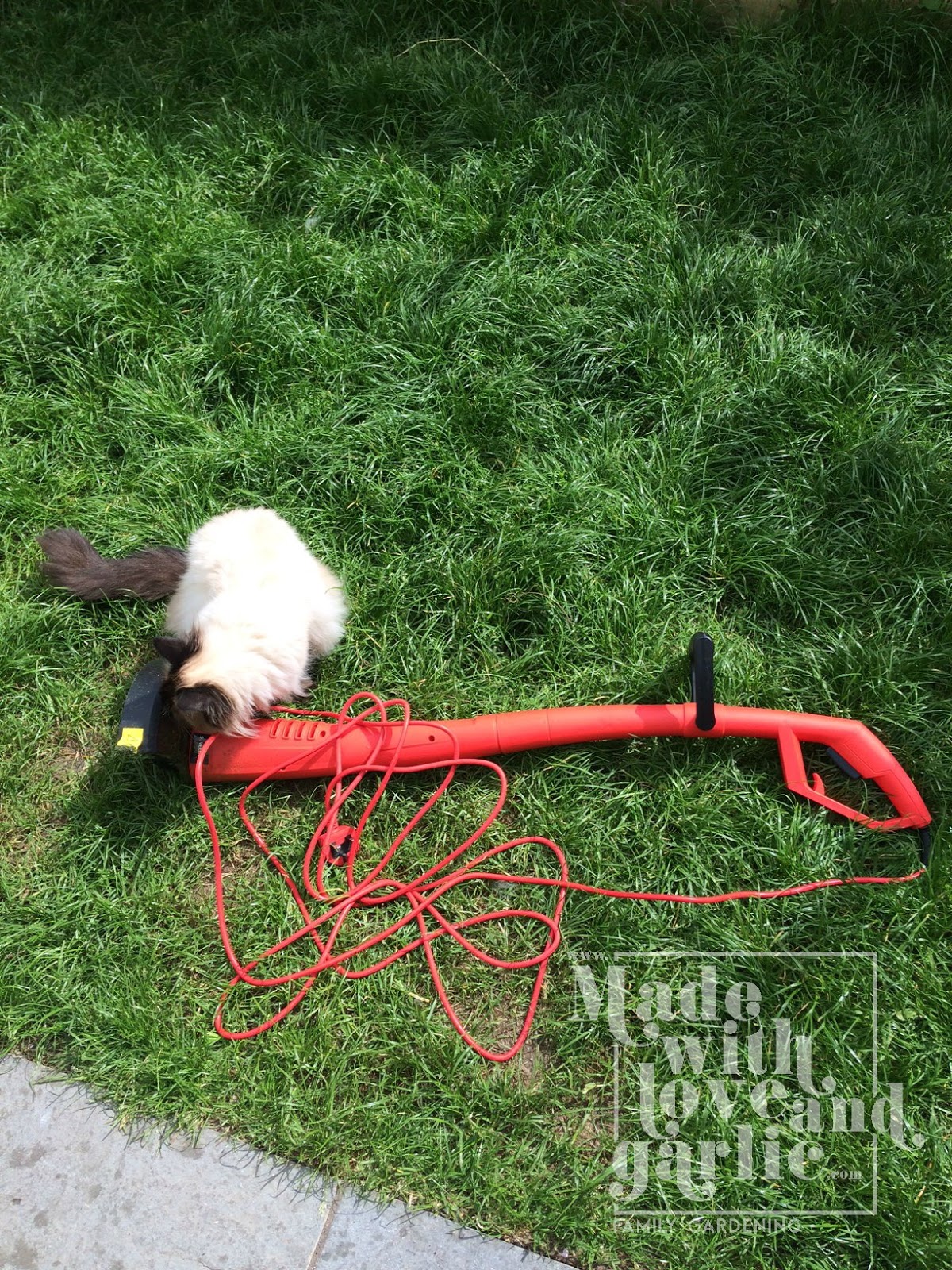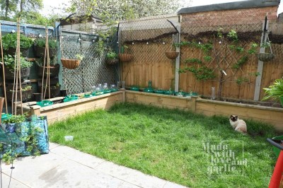 The longer I live in town, the more I despair at the overly sanitised way of life that seems to be taking over. Decking and patios sprawl over what little green is left, this carpet stuff is being poured over real green spaces (with none of the benefits of normal lawns that the RSPB highlight) and few gardens have real grass any more. That might, admittedly, be one of the reasons why we seem inundated with enormous terrifying spiders with big bottoms. Presumably ours is one of the few gardens in the area with any actual grass and so they’ve all decamped to our place. We used to have a patio, but it was very uncomfortable to sit on and I noticed that GarlicBoy used to be reluctant to crawl off our picnic blanket in the park and so wanted him to have some grass to play on so that he got used to it. But here’s the rub. My lawn area is tiny, so much so, that a lawnmower wouldn’t really fit on it, or be easy to store, but it is still way too large to cut with scissors alone. Given that the grass grows at an astounding rate (naively it never occurred to me that I would have to cut it every ten days), a solution had to be found. My solution? A strimmer. Yes, I still have to store it, but it’s quite compact and fits nicely into the playhouse, plus it doesn’t have any blades that inquisitive little hands could get hurt on. It doesn’t work around the edges so much to my country husband’s enduring amusement I still have to crawl around the perimeter cutting the grass there with scissors but that doesn’t take too long. Having to rake up the grass with a hand rake isn’t too bad either and it means I spend more time outside wrapped in that heavenly cut-grass smell.