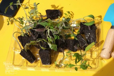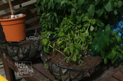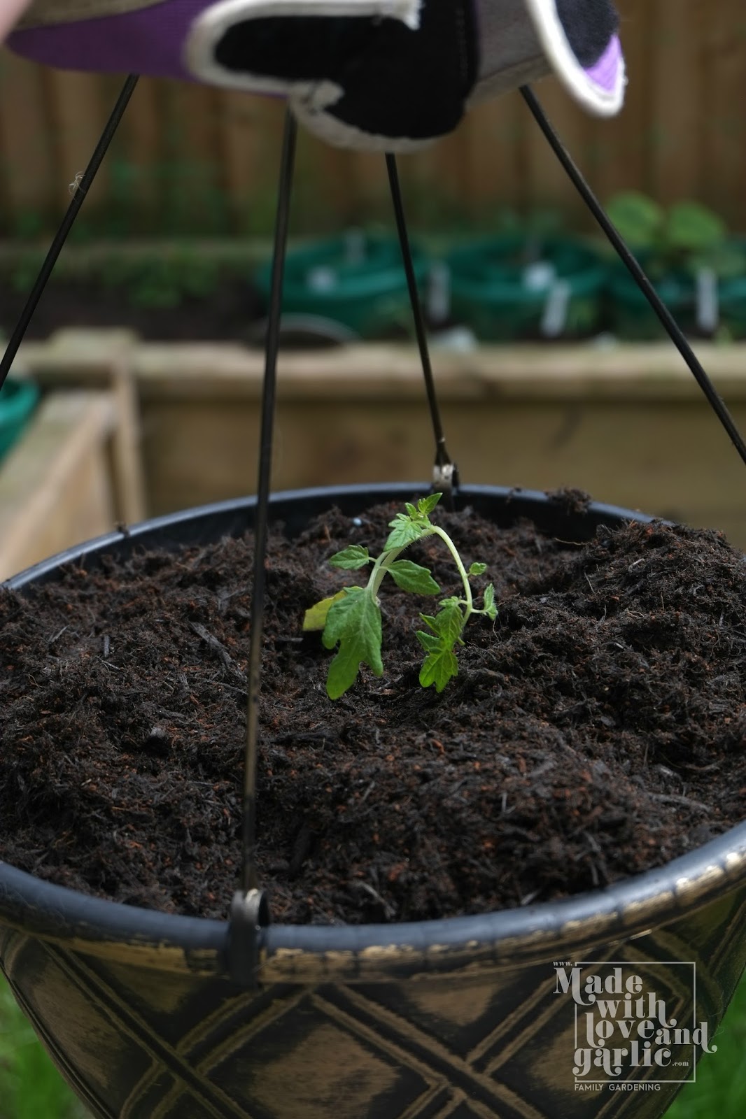 In hindsight, I should have known that putting two types of tomato seedling (the tumbling “Losetto”and the climbing “Magic Mountain” in case you’re interested) together in a large pot separated only by a seedling tray was a mistake. It was perhaps inevitable that a cat would jolt the pot onto the floor causing them to get mixed up but the heavens opened and I fled inside, abandoning the seedlings to their fate. So now I have a bunch of seedlings that all look alike that I’ve had to apportion, almost at random, into hanging baskets and raised beds. I suppose I’ll only know if I got it right once they start to grow, but what a shame to have replaced my (ragged, hole-ridden, snail-mangled) basil if I’ve gotten the raised bed ones wrong!