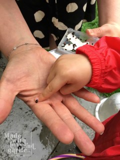 5. [ADULT] Retain one small ladybird and encourage it to walk onto your finger (by placing your finger in front of it as a ramp – they’re fragile so don’t try to pick them up with your fingers as you will damage their wings). Allow your child to look at them up close and have them walk on their fingers if they like, reiterating that they mustn’t stroke or touch the little creatures.