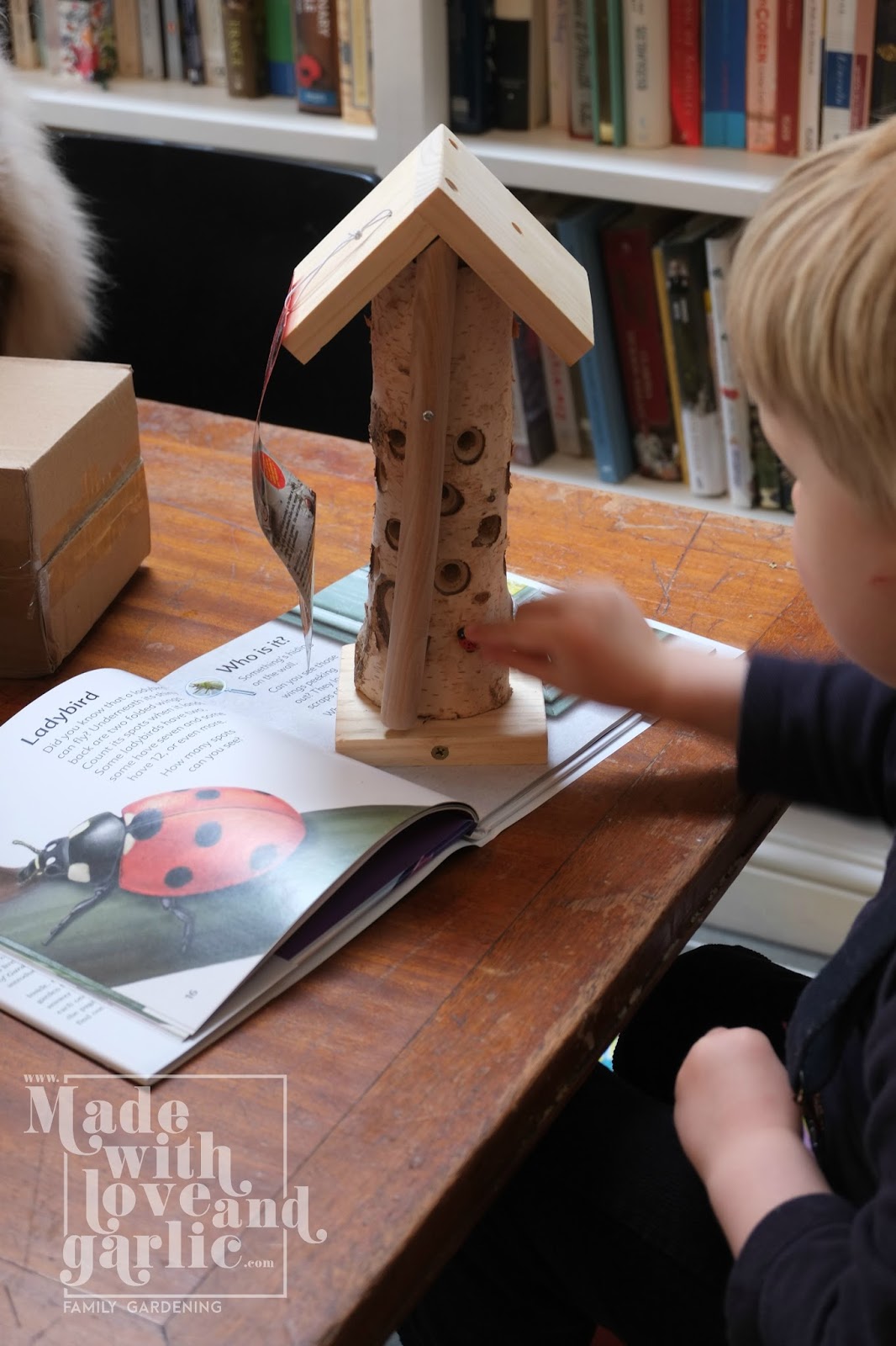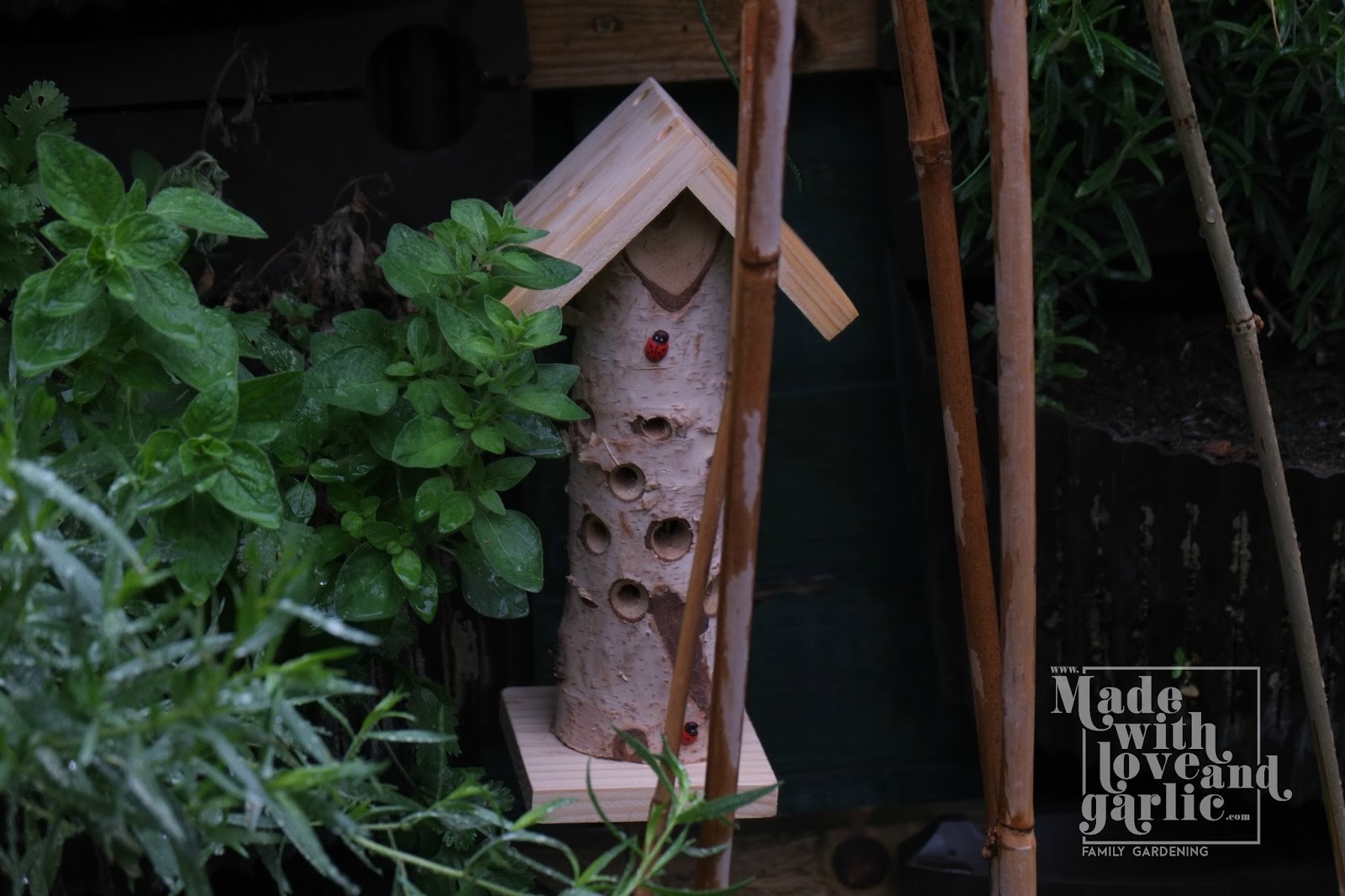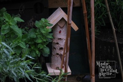 The day the aphids came back was a dark one. There they were, hordes of them swarming and pulsating all over my innocent strawberries and mint. I was beside myself in rage and frustration at their sheer numbers (previously I’ve always pulled aphids off by hand before their populations reach critical levels) as it was clearly too late for me to get rid of them alone. And then lo, out of the house wandered my husband, a king amongst men, who announced that he’d bough me a present of ladybirds. That’s right, 100 live ladybirds were winging their way (hah!) towards me, along with a couple of ladybirds houses that I could apparently try to bride them to stay with. Two year old GarlicBoy was thrilled at the idea of a couple of boxes of insect “pets” and chattered happily all the way home from the post office about them. This is one project that I can heartily recommend that you do with a toddler or small child. It benefits your garden, teaches your child about insects and the food chain and encourages wildlife to flourish in your immediate area. And children find them charming!