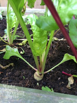 Last week I thought that I’d be enormously smug and plan a lovely afternoon of cooking with my toddler son. He’s always so happy when he’s perched on his tiny stepladder with his little apron on, cracking eggs or stirring things and tasting everything within reach. What could complete this middle class John Lewis advert of an afternoon? Why, to have him pull up one of our enormous beetroots from one of our raised beds and to cook beetroot chocolate brownies of course! So when we went to pull up the beetroots that were busy waving their ginormous leaves in the wind, it was a bit of a shock to find that they were tiny puny undeveloped roots! It turns out that the plugs I’d sown had multiple beetroots in each of them so none of them had space to grow. So we bought (to my shame) some backup beetroots to stick into the brownies and whilst they were cooking I went out to try to thin the beetroots.