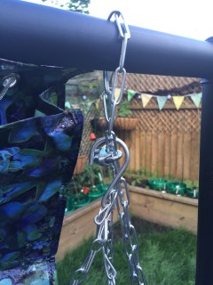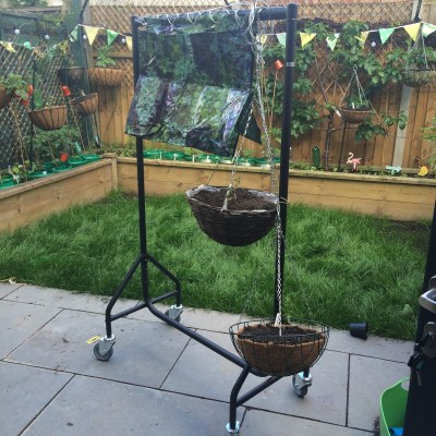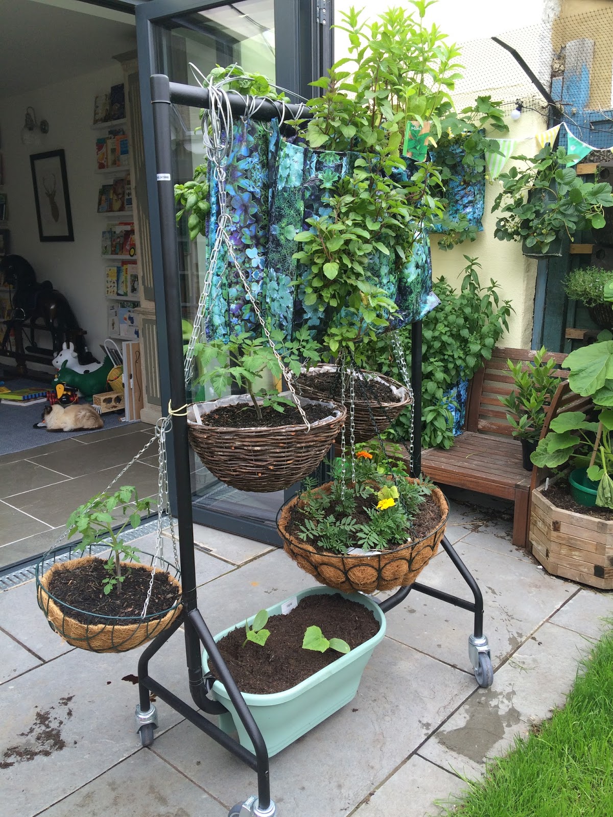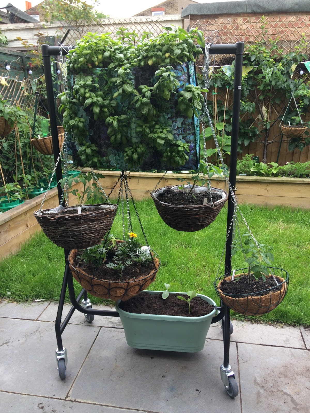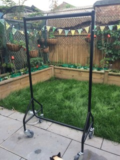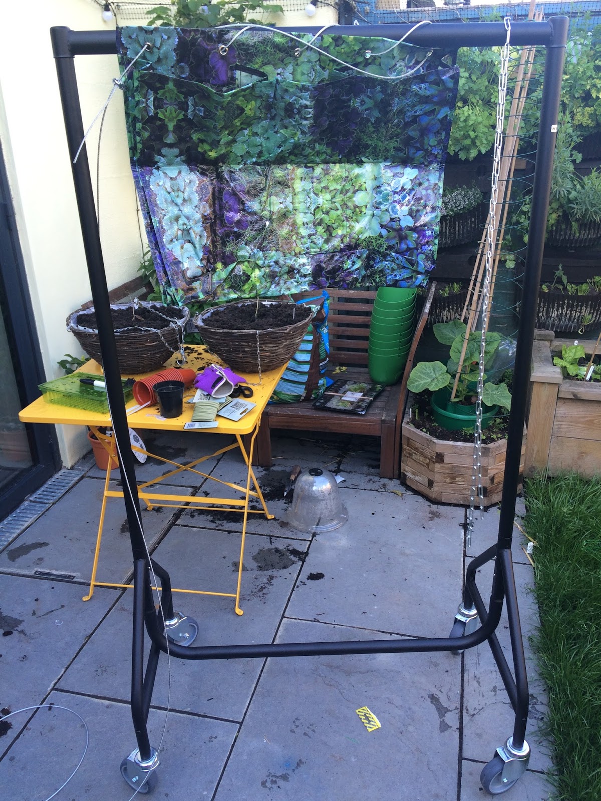 This is a DIY that not only doesn’t take long, it doesn’t involve any tools at all and so is something I’m really pleased with. I’m always looking for new spaces to grow things in my garden but short of tine hover boards being invented in the next couple of weeks, I’ve always despaired at the lack of vertical space on which to hang things. I have a whopping 44 wall planters and hanging baskets and to be frank, I’ve run out of space to hang them (having been reduced to hanging them from sticks). I don’t want to fill the small patio we have with heavy pots because my toddler GarlicBoy needs somewhere to play and we need somewhere to sit. So I started thinking. What if I put some pots on skateboards and just wheeled them about into the house whenever I needed the patio? The idea wasn’t entirely ludicrous but it clearly wouldn’t be worth the effort for just one pot. And that’s when it hit me. A hanging rail! A heavy duty one would provide me with a considerable amount of growing space in the form of four hanging baskets, two large herb planters and a large trough planter and best of all, I could wheel it out of the way in seconds when I needed to use the patio. I think there’s space on the market for a proper one of these (I call it “The Germinator”, patent pending of course…) as they’d be very useful on balconies as well I should think. \