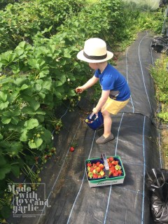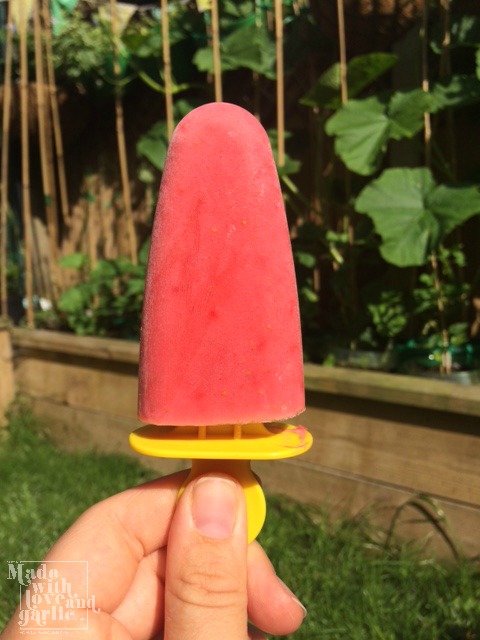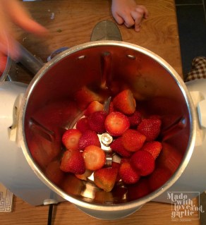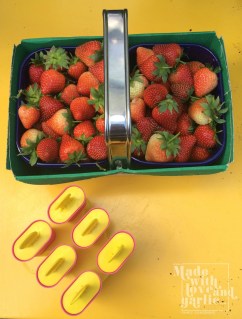 I’ve always tried to incorporate our own produce into my cooking but there are times where what we get from our tiny garden sadly just isn’t enough for any one project. Take, for example, strawberry ice pops. I like to make homemade ice lollies for GarlicBoy so that I can let him eat his fill without worrying about his teeth but to do that we needed considerably more strawberries than I could get at home. So we after picking the three ripe fruits from our own plants, we headed to our local “pick your own” farm and spent a very enjoyable afternoon filling punnet with fresh strawberries before coming home to turn them into delicious cooling treats.