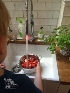 1. [BOTH] Go and pick the strawberries, ideally in your garden or a local farm. I found that even a very small toddler had marvellous fun trying to find the ripe strawberries in the plants.