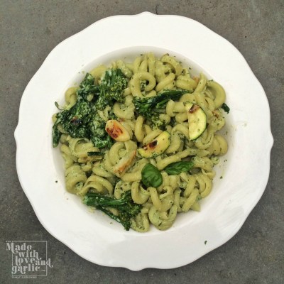 This is a really easy and tasty seasonal dish using home grown basil from the garden that I often make when I”m short of time. We are ardent carnivores but tend to eat vegetarian food during the week and this dish is absolutely delicious. We eat unholy amounts of garlic and so that sauce packs a powerful kick, do reduce the amount of cloves you put in if you’d rather go for a less intense flavour. But I find this is a lovely low calorie version of pesto that really zings and it’s all ready within the time it takes to cook some pasta.