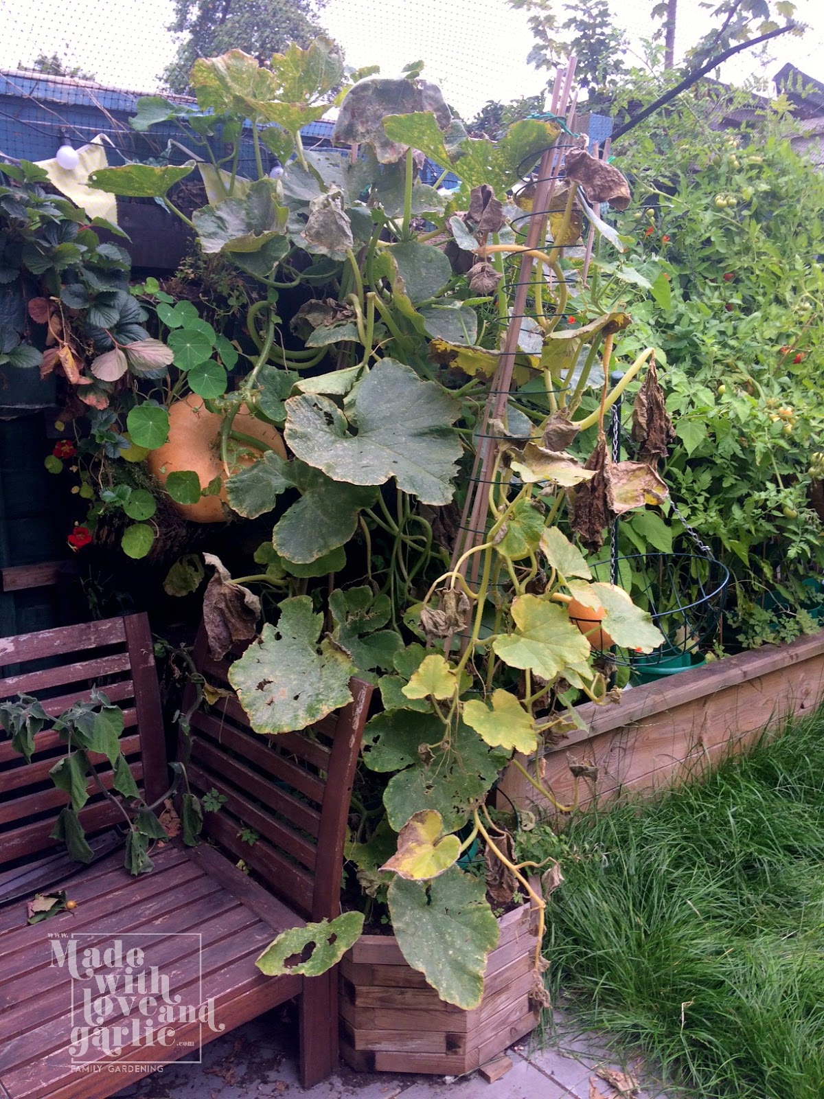 I’ve been generally pleased by the way that the pumpkins have grown vertically on a cane support in the garden. They actually haven’t fruited that much but that appears to have been down to poor pollination as I’ve had loads of tiny pumpkins develop and simply rot on the vine. Our tiny urban garden is a lone patch of green in a patio-clad part of South West London and I suspect that there just aren’t enough insects to do the work, although I’ve really enjoyed watching them frolic in the plants. Those of you that follow me on Instagram will know how proud I’ve been of this one giant pumpkin. I discovered it quite by accident when it started to outgrow the wall herb planter that it had sneakily colonised. It’s been getting bigger and bigger and has been pulling my planter off the fence so today I decided that we need to give it a bit more support. That’s not easy in such a tiny garden, so as it’s late August, I made the decision to go for broke and put all of my hopes on that one fruit. So we removed the three canes that the vine has been climbing and leaned the plant over sideways to sit the pumpkin on a chair where (hopefully) it can continue to grow and swell in the sunlight. I do think it’s funny that the pumpkin has a sort of muffin top where it was sitting in the wall planter! I’d actually be happy with the size the way it is but I think it can get a bit bigger, I’ll give it until mid-September and then cut the pumpkin free to eat.